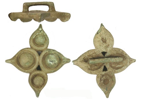 Cast cu-alloy strap slide dating from the Early Roman period, c. AD43-200. The strap slide is complete and undamaged with a nice, even patina and almost no surface damage. It displays a moulded boss-and-petal or teardrop decoration on the obverse whilst being plain on the reverse. On the back, however, it has a rectangular loop for attachment on a strap. The teardrop- or petal-and -boss decoration on the obverse is well known from button-and-loop fasteners of the same period (examples have been recorded under WILT-2f9063, SWYOR-B4D9F1, YORYM-AF1344, LANCUM-FEA2A1 and LANCUM-CF9125). This type of decoration characterises Wild’s Class III button-and-loop fasteners. Chronology Broad period: ROMAN Period from: ROMAN Period to: ROMAN Date from: Post AD 43 Date to: Ante AD 200