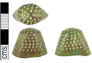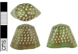 Cast cu-alloy thimble with individually drilled holes dating from the late medieval period, i.e. c. AD1550-1600. The thimble is complete with c. 250 individually drilled perforation, made by a ‘thimbler. It is made from vey thin sheet metal and is now bent. It was found by the edge of the field, where, so it is said, in later medieval times the women sat to do needlework whilst their husbands and other male relatives were working in the field, using as much daylight as they could. Chronology Broad period: MEDIEVAL Period from: MEDIEVAL Period to: MEDIEVAL Date from: Circa AD 1550 Date to: Circa AD 1600