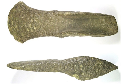 Cast cu-alloy short flanged axe dating from the Middle Bronze, ca. 1500-1150BC. This axe is likely to belong to the Acton Park 2, Taunton (Cemmaes) or Pennard metalwork assemblage, corresponding to Needham’s (1997) Period 5, c. 1500-1150BC. The axe is very worn, especially the lower part and the blade. A curious feature is that one side the flanges are much longer than on the other. This is unusual; normally the flanges are of equal lengths on both sides. The blade is narrowly, but much curved and a couple of dents and nicks might indicate wear. The upper part of the axe is not as worn as the lower (judged by the surface) and the reason for this may have been the fact that it probably was protected by the shaft before it rotted away. Chronology Broad period: BRONZE AGE Period from: BRONZE AGE Period to: BRONZE AGE Date from: Post 1500 BC Date to: Ante 1150 BC