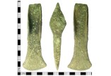 Cast cu-alloy flanged axe dating from the Middle Bronze Age, i.e. c. 1500-1300BC. It is part of the Taunton metalwork assemblage. The axe has two triangular flanges and with its small stop-ridge it could possibly be related to the shield-pattern palstaves of the Acton Park metalwork assemblage to which it bears some resemblance. The axe is a heavy implement and complete with the two flanges and a very worn crescent-shaped blade. It has a dull green/brown patina and is, overall, in good condition. The surface on the lower part of the blade looks quite worn, however, and due to the large patches of active corrosion it is difficult to tell if there are any signs of wear (e.g. indentations or re-sharpening marks) on the surface Chronology Broad period: BRONZE AGE Period from: BRONZE AGE Period to: BRONZE AGE Date from: Circa 1500 BC Date to: Circa 1300 BC